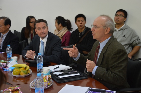 2013年10月25日上午,来自美国路易斯安娜州立大学的MBA项目主任Edward Watson教授、Ye-sho Chen教授及校友Kirk Fisher先生一行来到永利官网,就永利官网与路易斯安娜州立大学开展MBA咨询课程合作等事宜进行会谈。MBA教育中心副主任贾晓菁副教授以及学生代表梁京晶、刘琛、吕琛、宋春江等同学在MBA中心会议室会见了客人。