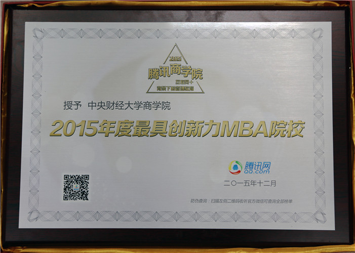 MBA联合会主席曾洁代表中财77779193永利官网领取“腾讯网 2015年度最具创新力MBA院校”奖