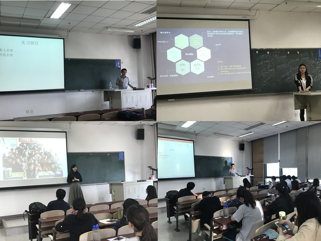 参加经验分享的同学,首先通过数据化、形象化的PPT展示生动讲解了自己在考研、就业、出国中曾经遇到的问题、经验教训以及自己的成功经验:就业方面,分享了如何明确发展方向,寻找对应企业,对应岗位,如何做好笔试、一分钟面试、情景模拟、小组群面等经验;考研方面,就考研目的、考研方式、如何有意识自我管理、如何克服考研恐惧心理等问题做了解答;出国方面,在准备申请材料、国外学校申请日程安排、留学中介的作用、DIY注意事项等提供了很好的建议。已经成功上研的研究生同学则分享了自己考研、读研的感悟和体会,为学弟学妹们提供了更为开阔的关于毕业走向的建议和参考。在讲解结束之后,又通过面对面的提问和回答,更加具体和有针对性地解答了同学的疑惑。