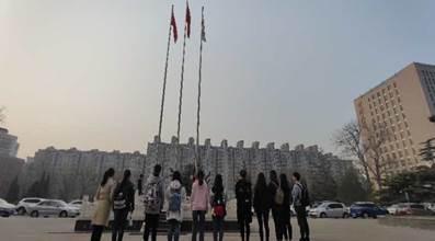 初春寒冷的清晨,踏着晨光,举行升旗仪式。朝阳一点点展露,全场的气氛庄重而严肃。随着国歌声的响起,升旗手升起五星红旗,在旗杆顶端猎猎飘扬。随后,团支书孟庆平围绕个人初心与梦想进行主题演讲,不忘初心,青年担当。