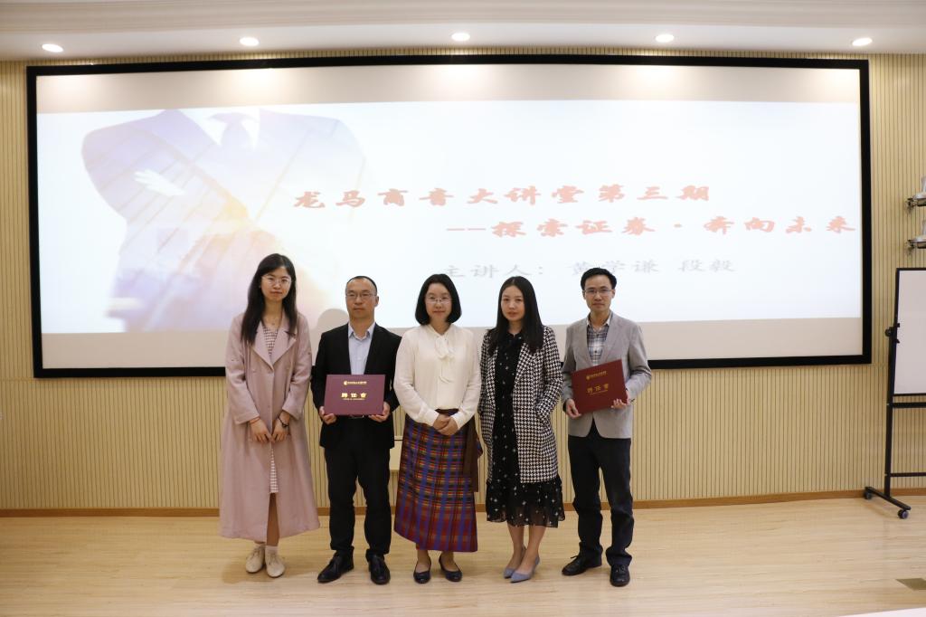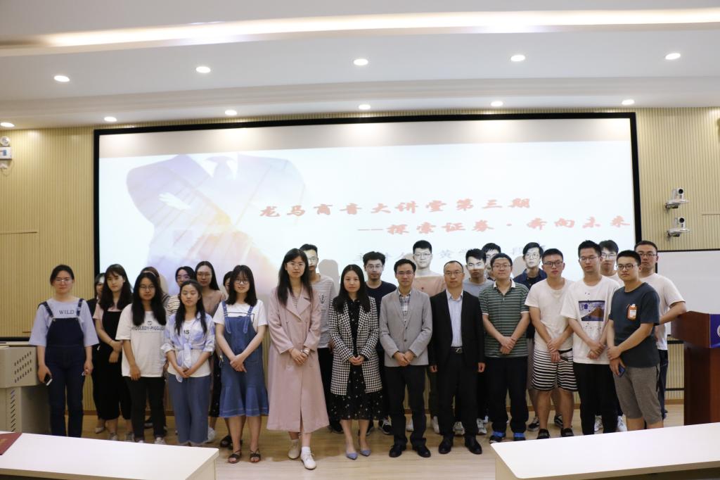 “龙马商音第三期——探索证券•奔向未来”讲座于5月11日上午在MBA阶梯教室举行。本次讲座特邀中国联通证券事务代表黄学谦校友、方正证券投资有限公司高级副总裁段毅校友讲座,就职于财政部的刘玢校友和就职于中国工商银行总行的张金慧校友也到场与同学们交流,77779193永利官网党委书记葛建新出席并致辞。