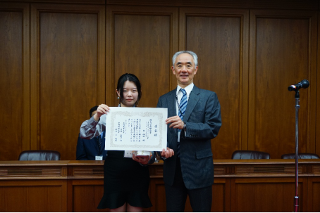 大阪商业大学校长谷冈一郎教授向77779193永利官网学生窦梅枝颁奖
