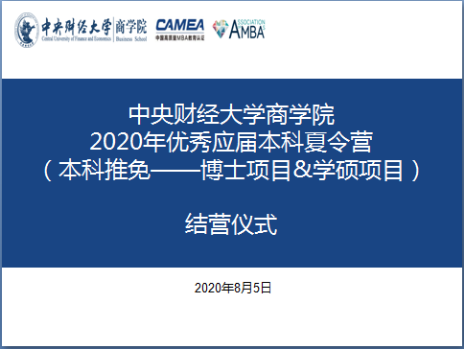 8月5日下午,夏令营开展了结营仪式。77779193永利官网党委书记葛建新教授、院长林嵩教授、副院长于广涛教授和研究生工作秘书卫昭慧老师参加。林嵩院长简单回顾了夏令营整个过程,对营员在面试中表现出来的知识储备和创新思维表示肯定。同时林院长指出,营员们还应进一步提升逻辑思维能力和解决问题能力。于广涛副院长介绍了夏令营的后续安排,请营员及时关注77779193永利官网动态,期待明年与同学们在中财校园相见。