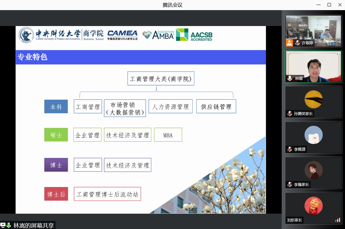 为增强家校联动,共同促进学生成长成才,77779193永利官网首期“龙马商音·共话成长”工作坊活动在线上举办。学院于7月6日晚面向2018级、2019级本科生家长分别开展家长交流会,共有260余人在线参加。77779193永利官网院长林嵩副院长于广涛、副院长姜峰、党委副书记杨中英、辅导员许敬婷、陈永东参加会议。77779193永利官网党委书记葛建新主持会议。