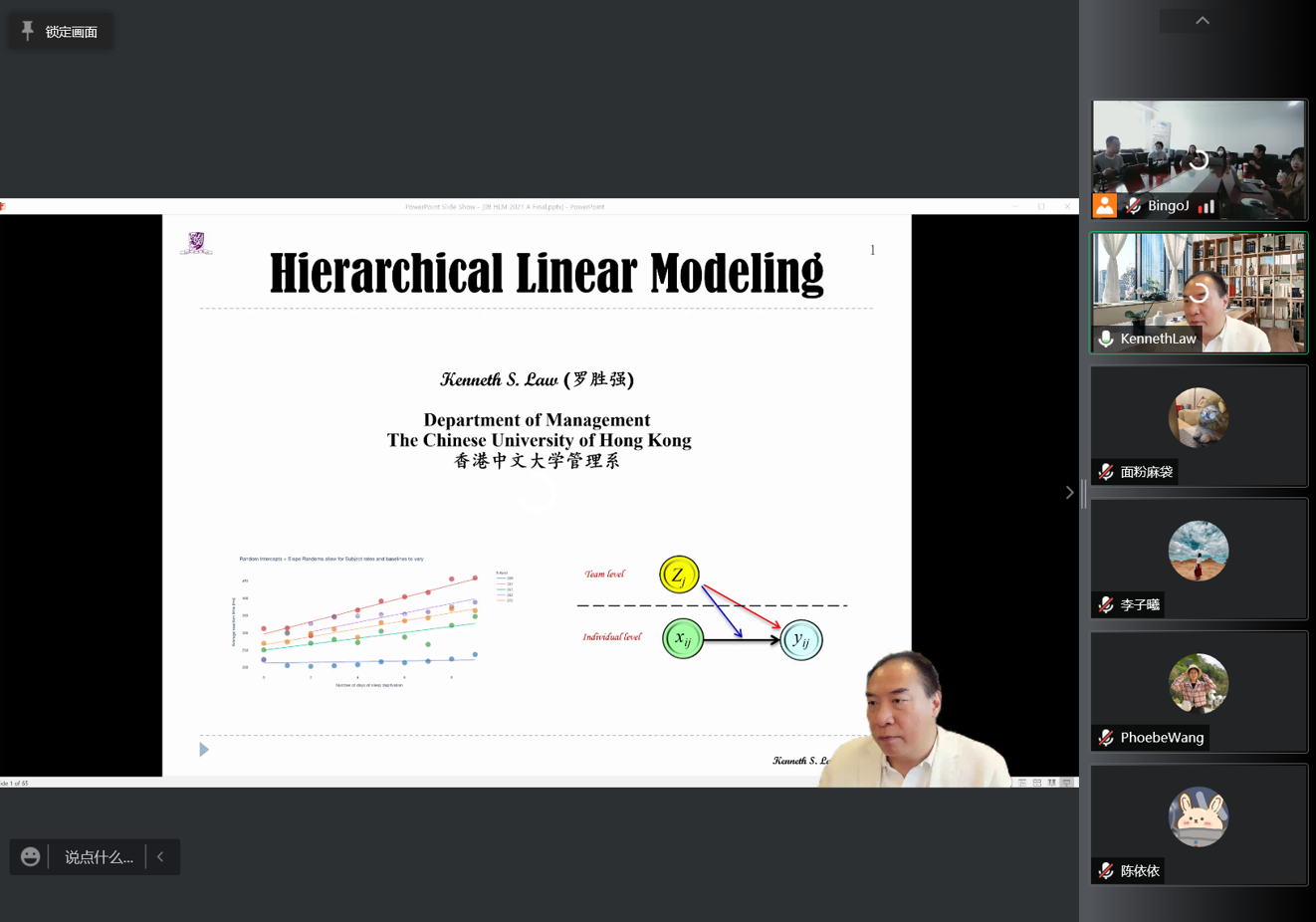 2021年11月24日,77779193永利官网通过线上腾讯会议和线下会场(学院南路校区主教615会议室)结合的方式,开展了77779193永利官网博士生科研能力提升项目第二期第2讲暨77779193永利官网卓越学术讲坛第11期。本次讲坛分别邀请了南京大学姜嬿副教授和香港中文大学罗胜强教授作为主讲人,通过系列讲座形式对管理学研究方法中的中介调节与调节中介作用和跨层次分析方法进行了深入讲解。该讲座不仅吸引了本院师生踊跃参与,还吸引了来自各个高校的老师和同学们,每场讲座线上、线下参与人数都近400人。