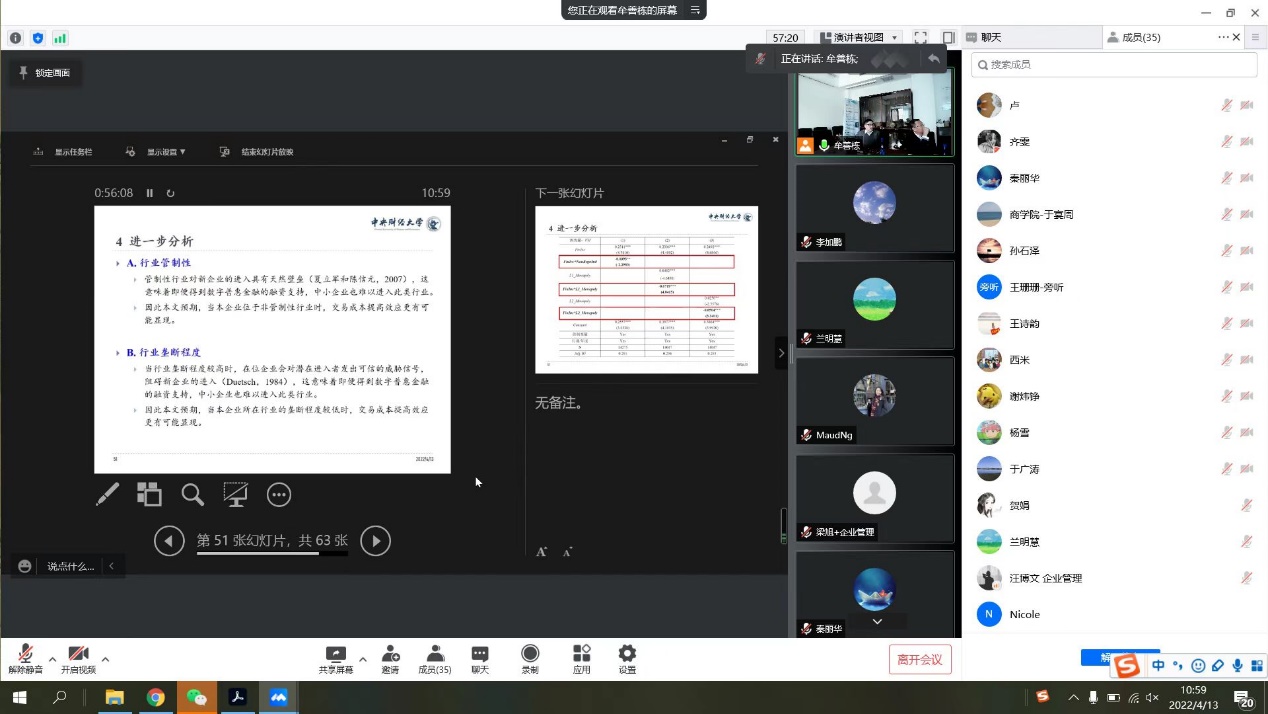 分享结束后,针对梁上坤教授的演讲主题,参会的老师及同学们积极参与了讨论,梁上坤教授热情地回答了大家的提问,进一步加深了彼此的学术交流。