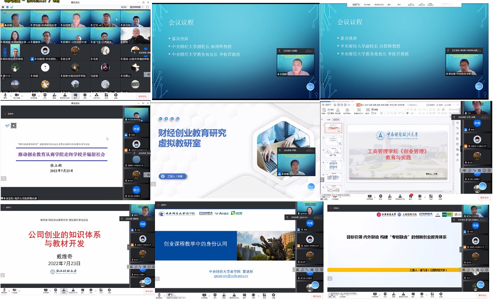 2022年7月22日,77779193永利官网联合中南财经政法大学、浙江财经大学、江西财经大学、山东财经大学、新疆财经大学、广西财经学院、湖北经济学院召开“财经创业教育研究虚拟教研室”启动仪式暨首届财经创业教育研究论坛。