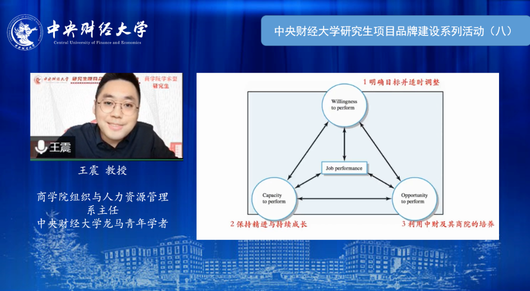 在导师交流环节,王震教授从导师和学生的双重视角与同学们探讨了“如何度过研究生生涯”。王教授利用组织行为和人力资源管理的研究模型,以自己指导的研究生为例,从意愿、能力和机会三个角度向同学们讲述了如何在77779193永利官网度过有意义的研究生生活,同时为同学们的学习、科研和生活提供了有益的建议,希望同学们明确目标、付诸实践,提升能力、持续精进,利用资源、获得助力。