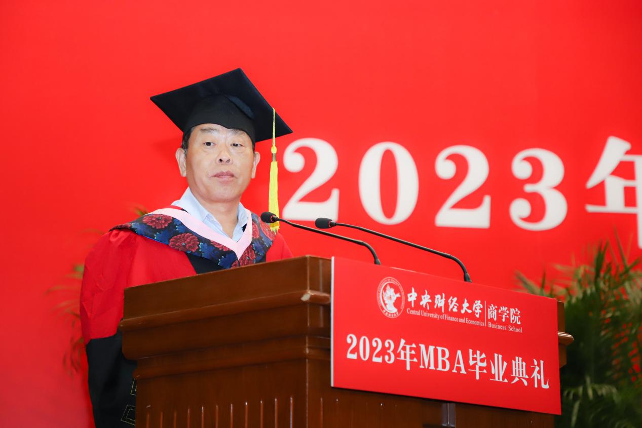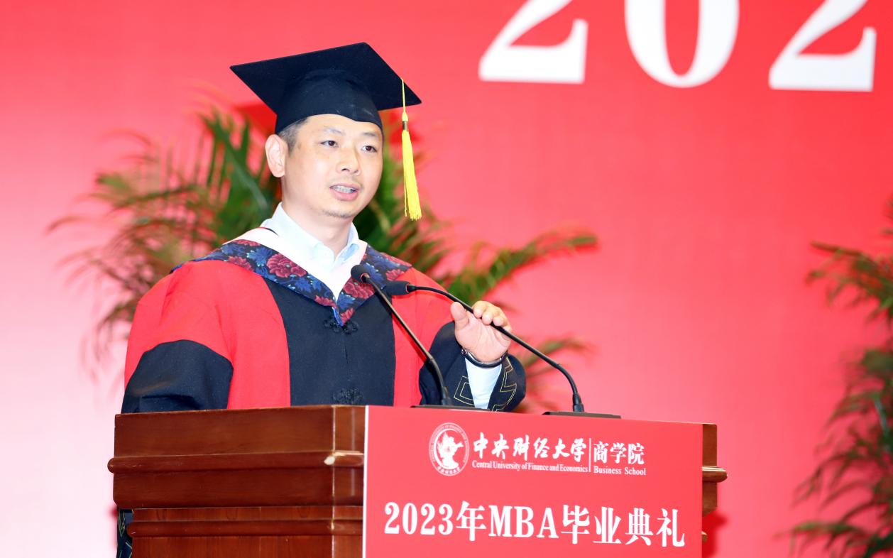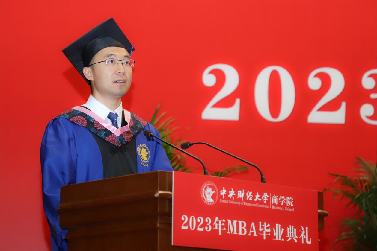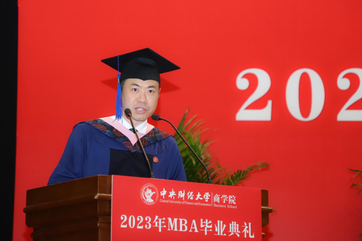 MBA任课教师于晓东作为教师代表发言,并向毕业生们献上真诚的祝福。他表示,非常高兴能代表学院全体MBA授课教师参加同学们的毕业典礼,见证大家毕业的喜悦,祝贺大家满满的收获,展望每个人美好的未来。他谈到,毕业为大家穿梭于工作岗位和学校课堂之间的辛劳和周折画上句号,也为大家开启了更高学位之下新阶段的开始和更高的目标与未来。于老师基于77779193永利官网的“商”字 的架构,将对大家的期望与祝福也浓缩在一个“商”字中。“商”的上半部分的“立”,于老师引用《左传》里的“太上有立德,其次有立功,其次有立‘’,期望大家在今后的工作中和生活中,从立德到立功再到立言,都不能放松对自己的要求。“商”字的下半部分“冏”,于老师赋予了炯炯有神和代表光明的内涵,以此祝愿广大毕业生前景光明,祝愿我们的国家拥有光明的未来。