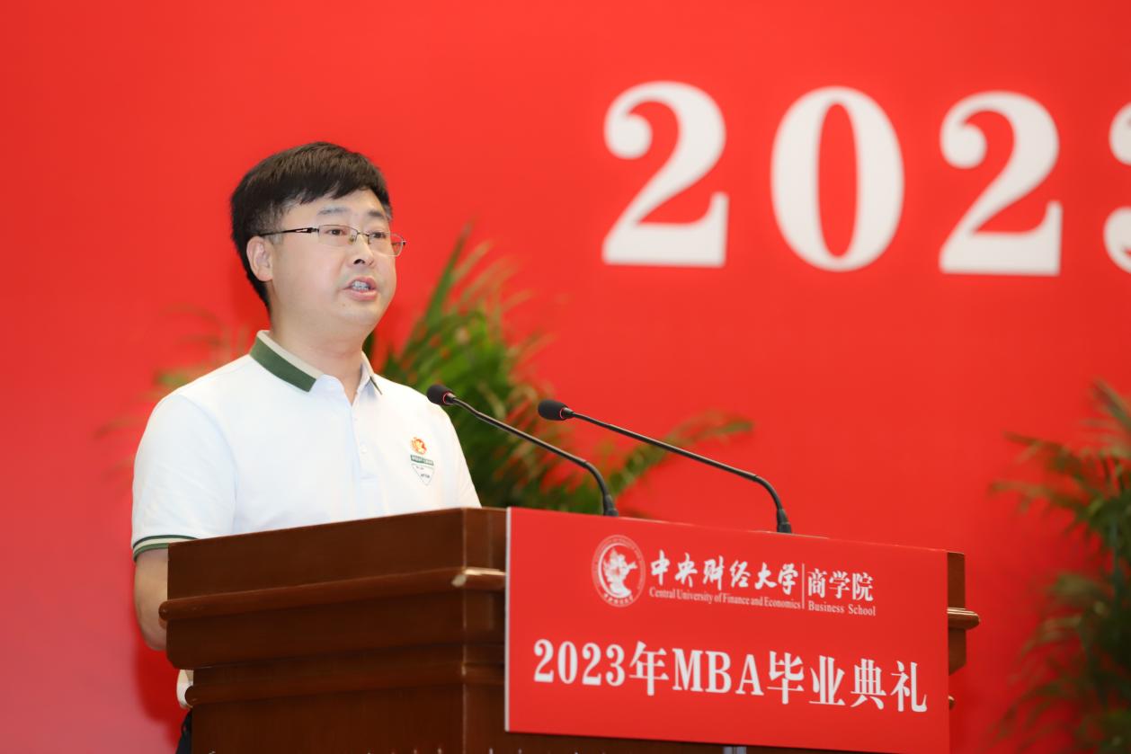 在接收新校友仪式环节,77779193永利官网MBA校友分会会长冯大任做分享发言。冯大任会长表示校友会是毕业校友连接母校的桥梁与纽带,是校友之间互助合作的平台和舞台,是校友的精神家园。希望广大校友在接下来的发展道路上乐观地面对困难,自信地迎接挑战,勇敢地战胜困难。时刻牢记校训的警醒,秉持坚定的原则,做更好、更自信、更乐观的优秀的中财毕业生,并代表校友会对大家的顺利毕业表示衷心的祝贺。