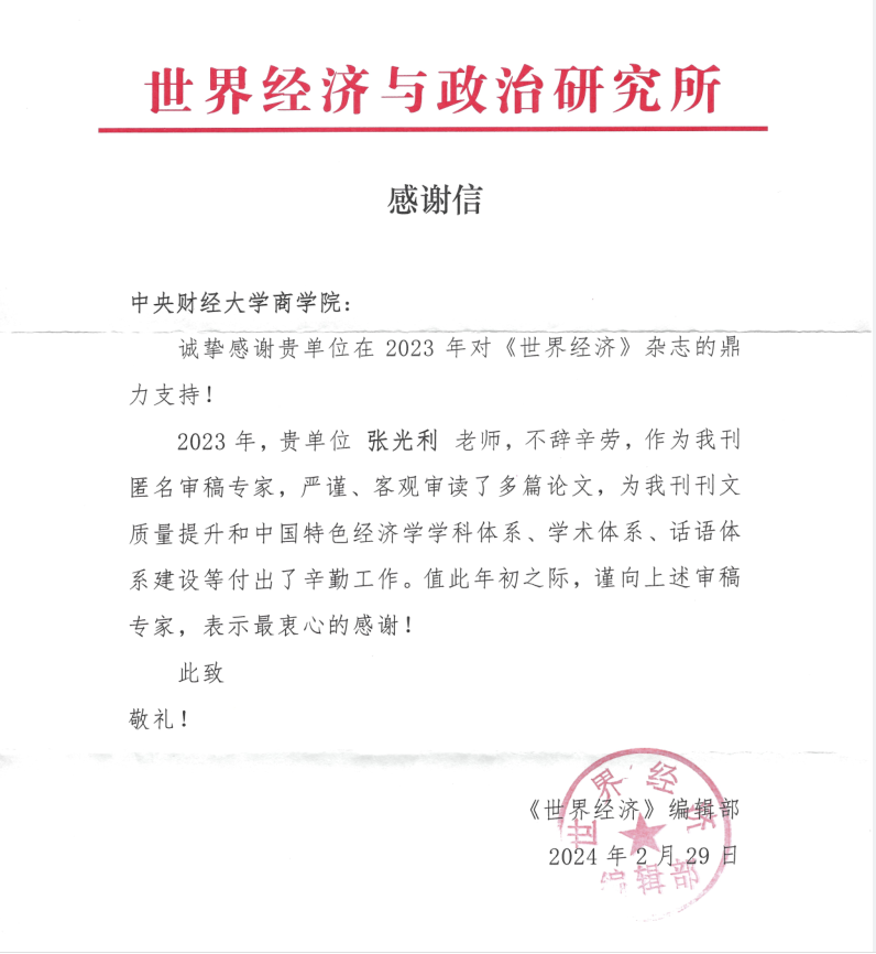 近日,《世界经济》编辑部向永利官网发来感谢信,感谢77779193永利官网在2023年对《世界经济》杂志的鼎力支持,特别感谢张光利副教授对期刊审稿工作的支持。作为审稿人,张光利副教授秉持严谨、客观的态度评审了多篇论文,为该刊物论文质量的提升和中国特色学科体系、学术体系、话语体系建设等方面付出了辛勤工作。