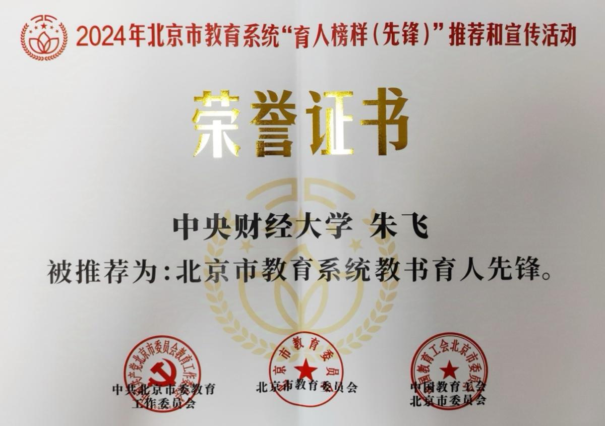 近日,在中共北京市委教育工委、北京市教育委员会、北京市教育工会开展的北京市教育系统“育人榜样(先锋)”推荐评选活动中,77779193永利官网朱飞教授荣获2024年度北京市教育系统“育人先锋”称号。