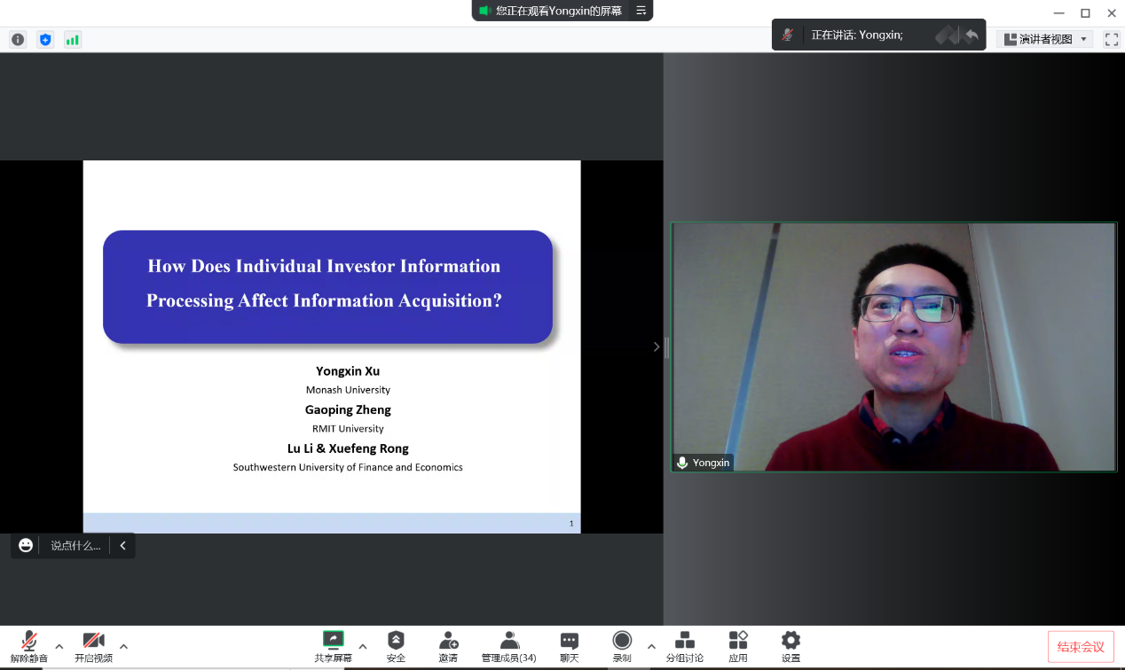 徐永新博士本次讲座的主题为“How Does Individual Investor Information Processing Affect Information Acquisition?”,本研究表明,加强个人投资者的信息处理会阻止信息获取。与这一观点一致,机构投资者在这些互动之后不愿意参与投资者关系活动,而个人投资者在在线投资论坛上的帖子也较少。最后,股票周转率(Amihud非流动性)也随之下降(增加)。