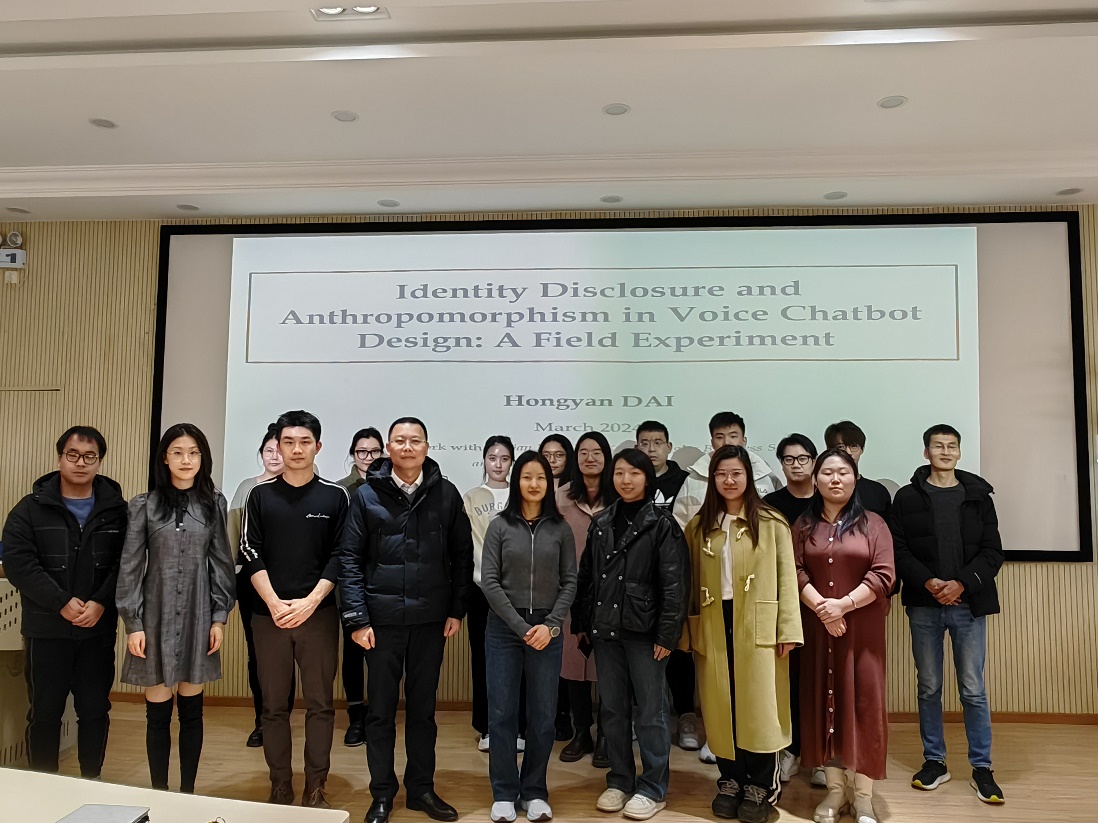 代宏砚教授讲座的主题为“Identity Disclosure and Anthropomorphism in Voice Chatbot Design:A Field Experiment”。在算法和人工智能(AI)的推动下,语音聊天机器人在各种商业环境中越来越受欢迎。本次讲座聚焦语音聊天机器人两个设计特征:身份披露和拟人化,关注了如何有效和适当地使用语音聊天机器人,并评估它们对企业运营绩效的影响。与一家大型卡车共享平台合作,通过随机指派了11000名卡车司机接收来自语音聊天机器人外呼电话的一项实地实验,研究发现在对话开始时披露聊天机器人的身份会对运营绩效产生负面影响,导致响应率降低。然而,通过增加拟人化特征(即插入词和填充词)使语音聊天机器人更加拟人化,显著改善了响应率、对话长度和订单接受意愿。本研究对于有效实施语音聊天机器人在商业环境中提供了有价值的建议。