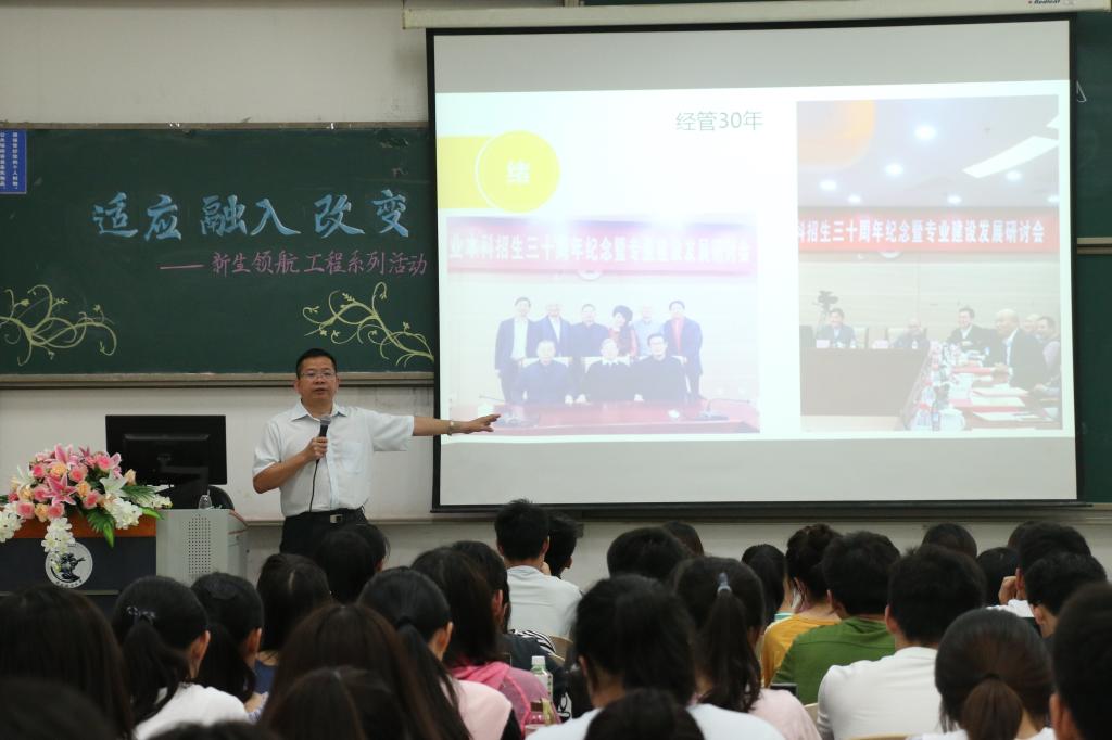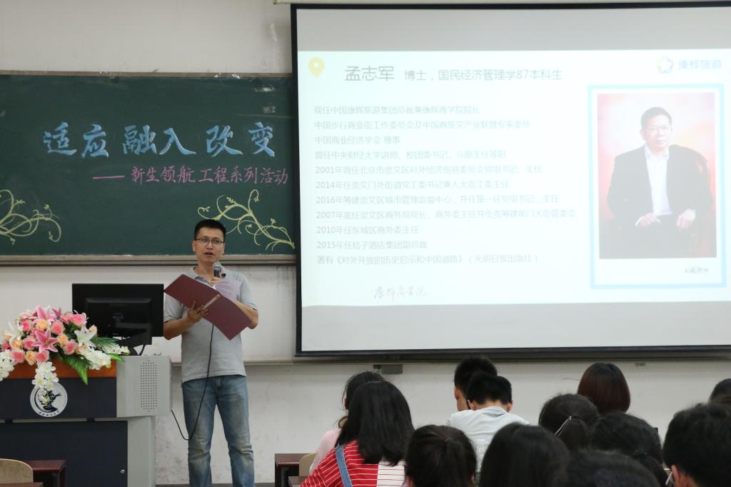2018年5月16日下午,77779193永利官网邀请到永利官网经管系87级校友、康辉旅游集团总裁孟志军来到沙河校区,在主教214为全院大一学生做了以“适应、融入、改变—新生领航工程系列活动”为主题的讲座。77779193永利官网学工办主任、17级辅导员张碘老师主持了本次讲座,77779193永利官网团委书记、15级辅导员王婷婷老师出席活动,并与嘉宾和观众进行了深入的交流。