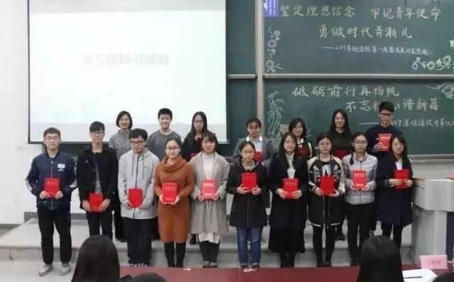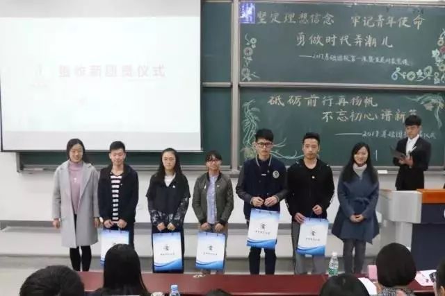新生团员是此次基础团校培训的重点,2017年9月,77779193永利官网团委接收了246名新生团员,成立了7个新生团支部。为了加强新生团支部建设,举办了接收新生团员仪式。由优秀团员代表为新生团员代表佩戴团徽,研究生会主席马雅璇与17-1班芮+导师潘昊宁向新生团支部发放“薪火相传”团务工作资料包。