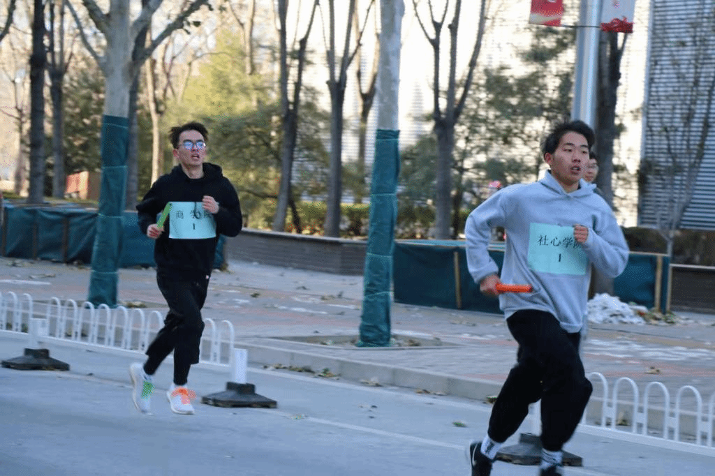 随后,选手们开始热身,以饱满的状态迎接比赛。口令枪响起,第一棒出发,比赛正式开始。虽然天气寒冷,但选手们每一步都拼尽全力,用他们的运动热情点亮青春,成为了赛道中的一抹亮色。