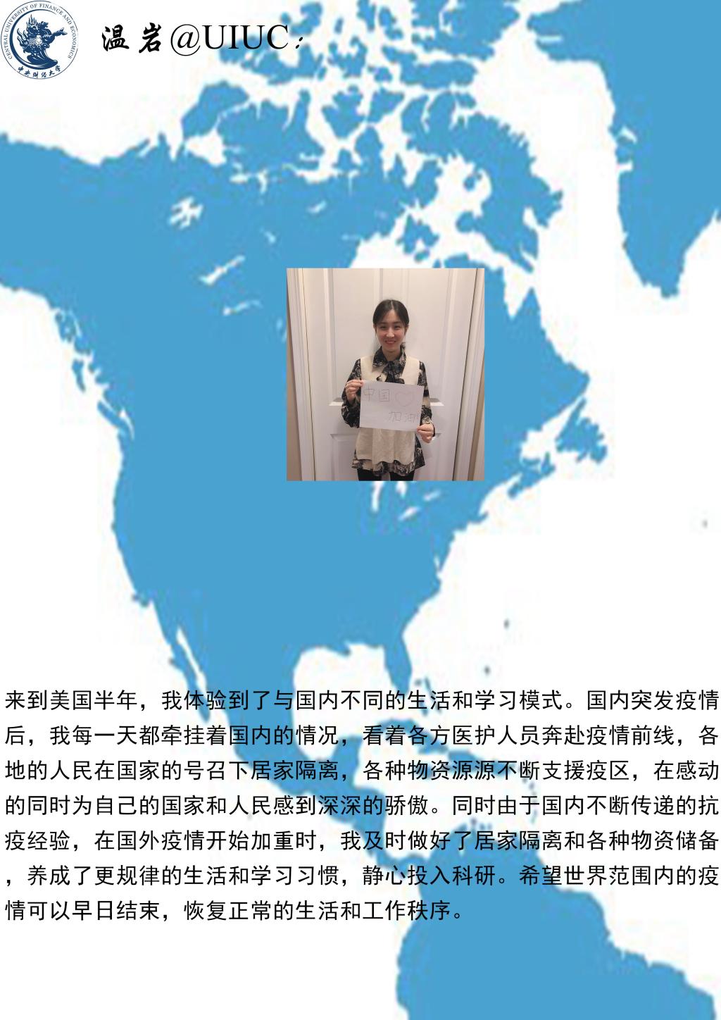The students reported on their life, work, studying and epidemic prevention, and expressed theirgreetings andconcern to professors and studentsat home, and gratitude for thecareful and thoughtful service of CUFE Business School. The students said that through the epidemic prevention and control, it is necessary to learn the right way ofthinking, to be independent, adapt to changes, reduce anxiety, face reality bravely, and dothose that would really help.