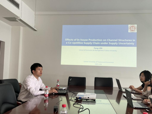May 24, 2021, CUFE Business School held the 3rd Session of the 2021 CUFE Business School Distinct Academic Forum. Dr. Lin Feng from the School of Economics and Management, Fuzhou University was invited to give the speech. Faculty members, master and doctoral students and undergraduates from CUFE Business School were attended. Dr. Lu Jizhou from Department of Supply Chain and Operation Management hosted the forum.