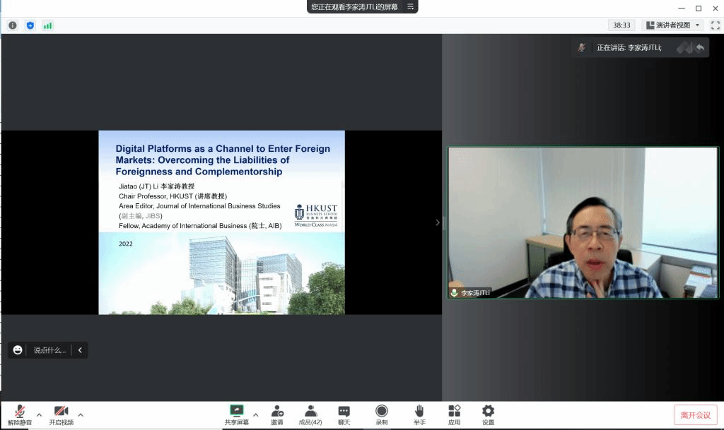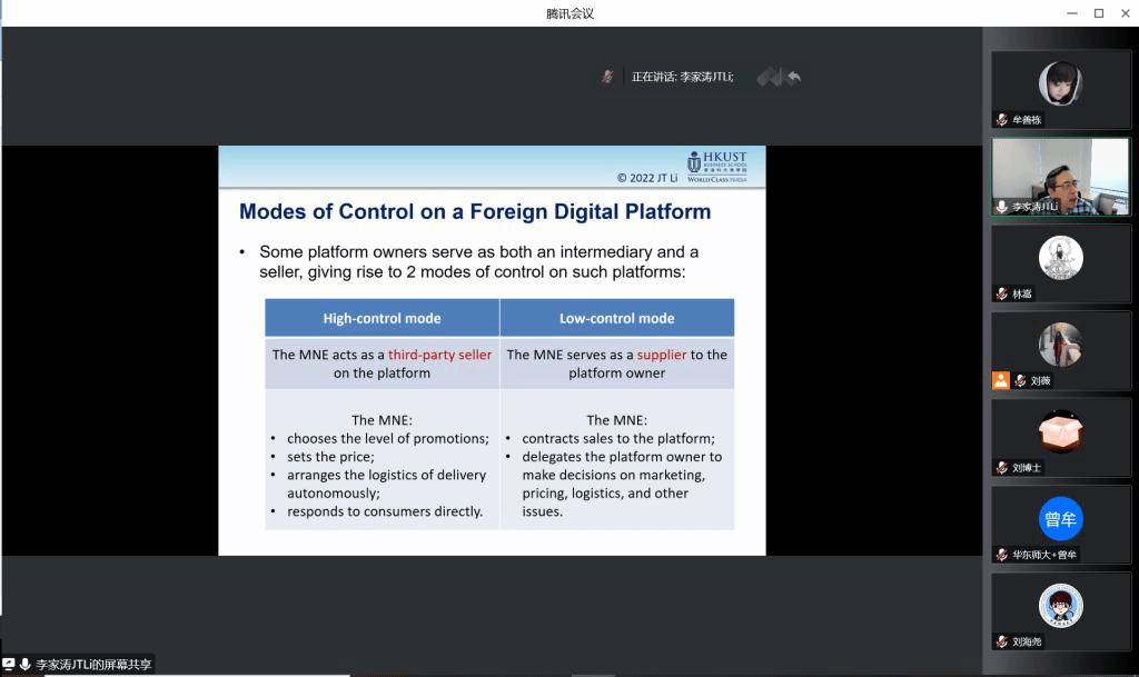 Professor Li Jiatao first introduced the special issue topics in JIBS to the teachers and students of the Business School, and shared his opinions with them in combination with the paper topic “Digital Platforms as a Channel to Enter Foreign Markets: Overcoming the Liabilities of Foreignness and Complementorship”. This research adopts the data of Amazon.com and JD.com, i.e. the leading e-commerce platforms in the United States and China. The research results confirm that: in comparison with the condition that the supplier serves as a platform owner, the sales will be lower if the supplier maintains control through selling as a third-party seller. Besides, the research findings suggest that the penalty for retaining control will be smaller for companies with stronger brands, and those companies whose consumers prefer digital business models. These findings provide new insights into how multinational companies leverage digital platform channels to enter foreign markets.