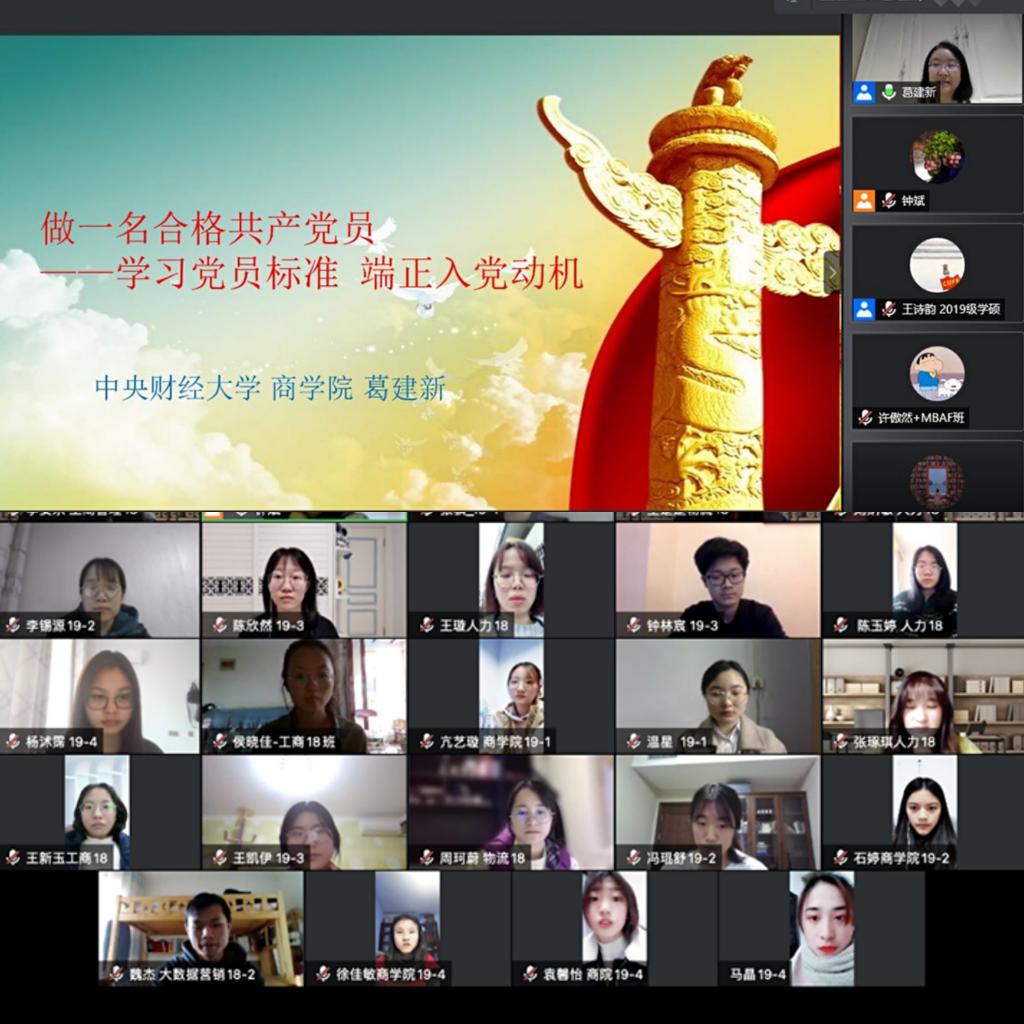 在主题党日中,积极分子集体观看了纪录片《同心抗“疫”——人民至上》,并共同学习了党章内容。在交流讨论中,积极分子围绕“谈谈你印象最深的优秀共产党员事迹,如何努力加入中国共产党”研讨主题,进行了体会和感悟交流。2020级学硕班的梅雨佳同学谈到:“在线上培训课程中,我印象最深的一句话是,多数人因看见而选择相信,但是少数人因相信而看见,中国共产党人就是这样的存在,因为坚守信仰,所以步履不停地艰苦奋斗、不畏困难,在各行各业、各个岗位上发光发亮,为着理想向前迈进。”市场营销2017级本科生陈梦迪同学说:“我身边的党员虽然大都是生活中平凡的一员,但是他们都在平凡的工作岗位上兢兢业业、甘愿奉献自己的青春与心血。在今后的学习工作与生活中我也会以身边的这些党员作为自己学习的榜样,会坚持自己的初心,投身社会,在实践中不断锻炼自己,在学校里认真学习、努力成长为党组织需要的人才。”大数据营销2018级本科生魏杰同学说:“做实事,真做事,这是我认为成为共产党的第一关,我认为只有这样才能做努力做葛老师说的勇于充当表率,起带头作用的合格的积极分子。”工商管理类2019级本科生温星同学说:“为了早日加入中国共产党,我们应该舍得‘荣誉’值得‘平凡’,舍得‘索取’值得‘吃亏’,舍得‘回报’值得‘奉献’,舍得‘艰苦’值得‘付出’。”