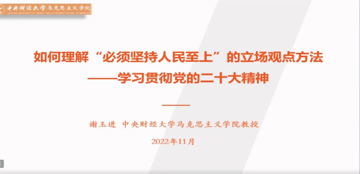 中国共产党第二十次全国代表大会于10月16日至22日在北京举行。为深入学习宣传贯彻党的二十大精神,把全党全国各族人民的思想统一到党的二十大精神上来,把力量凝聚到党的二十大确定的各项任务上来,根据《中共中央关于认真学习宣传贯彻党的二十大精神的决定》和学校党委有关工作要求,77779193永利官网党委于11月2日下午1时,组织召开学习宣传贯彻党的二十大精神专题讲座,特邀永利官网马克思主义学院副院长谢玉进教授作“深入理解‘必须坚持人民至上’的立场观点方法——学习贯彻党的二十大精神”主题报告。77779193永利官网全体教师、学生党员、2022级新生通过线上、线下相结合的方式参加本次活动。