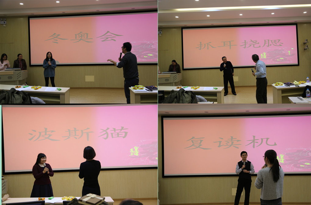 人力系老师则为大家开展了一个猜词游戏,今年的流行词语、经典成语等词汇通过一位老师表演、一位老师猜词,搞笑的表演、敏捷的反应,展示了77779193永利官网老师不仅具有高深的专业学识,也具备更接地气、跟上时代的网络知识。