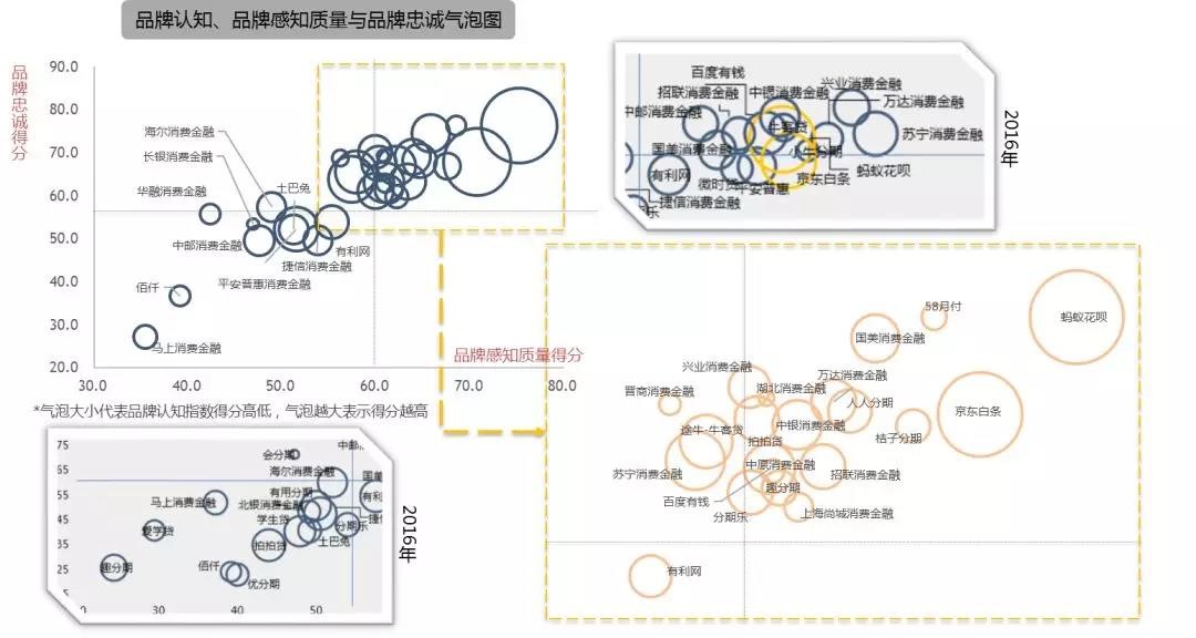 与2016年的指数得分气泡图进行对比,我们可以看到品牌感知质量和品牌忠诚依然基本成正相关的关系,连续两年的研究也更突出了口碑指数得分的预测意义。2017年的研究增加了对典型消费金融使用者的洞察,从客户认知渠道、贷前申请、贷中体验、消费场景、贷后满意度及还款情况等客户体验全旅程的角度评判各消费金融品牌。该报告连续两年的持续推出,对消费者、消费金融平台、消费金融产业以及相关政策制定者都具有重要的借鉴及参考意义。