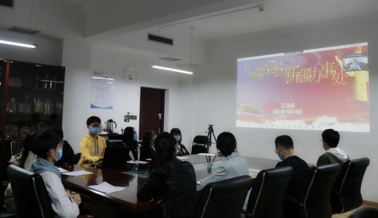 新疆财经大学国际经贸学院国贸系党支部学生代表介绍了八路军驻新疆办事处,再现了1937年—1942年以陈云、邓发、等为代表中国共产党人在新疆进行抗日救亡运动和不屈不挠狱中斗争的历史全貌。