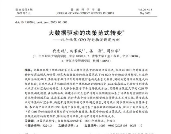 近日,永利官网代宏砚教授与清华大学陶家威博士、清华大学姜海教授及浙江大学周伟华教授合作撰写的《大数据驱动的决策范式转变——以个性化O2O即时物流调度为例》在权威学术期刊《管理科学学报》发表。